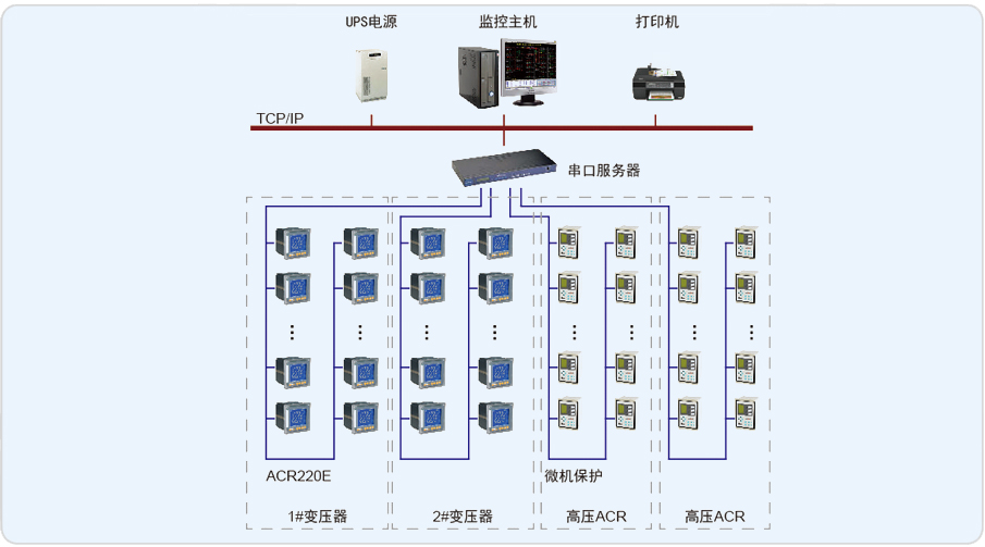 蘇州金閶中學(xué)共有一個變配電室,整個配電系統(tǒng)主要有2臺10/0.4 kV配電變壓器和2排高壓進(jìn)線柜,共計(jì)62低壓4個10kV中壓進(jìn)出線柜,實(shí)現(xiàn)了對整個學(xué)校的電力供應(yīng)。本項(xiàng)目電能管理系統(tǒng)主要對變電所內(nèi)62個進(jìn)出線回路及10kV配電回路進(jìn)行管理,實(shí)現(xiàn)電力參數(shù)實(shí)時遙測、電能計(jì)量、電能報(bào)表等功能。