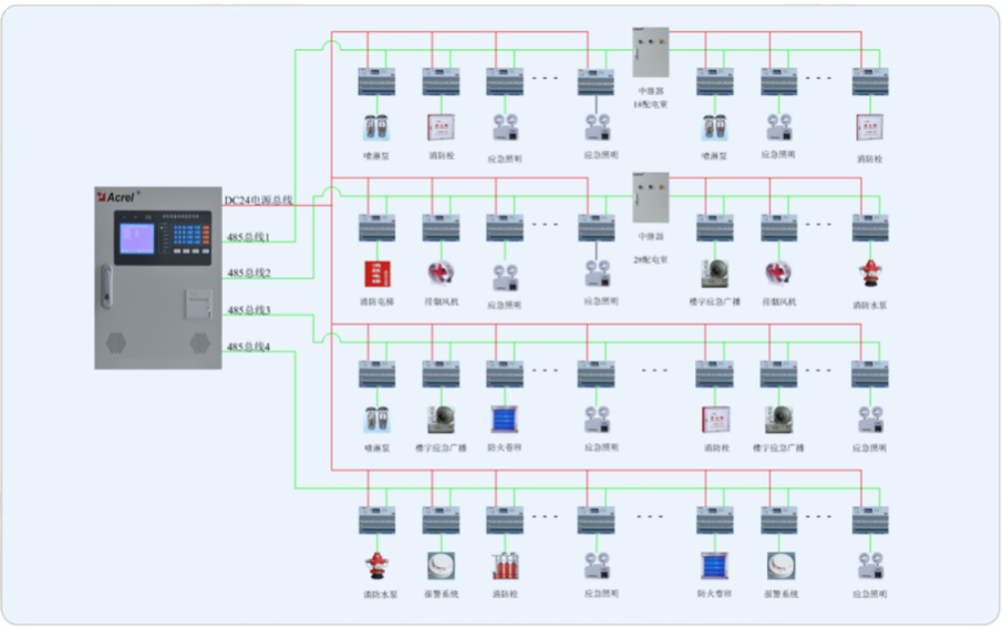 系統組網共分為站控管理層、網絡通訊層、現場設備層三層,該項目通訊總線共接入9條通訊總線,總線在樓層配電箱手拉手串接后,接入消防設備電源中繼器,在接入壁掛式后臺,組成消防設備電源監控系統的大動脈。AFPM100消防設備電源監控系統能夠對消防設備的電源進行實時的監控,通過檢測消防設備電源的電壓、電流、開關狀態等相關信息,從而判斷消防設備電源是否有斷路、短路、過壓、欠壓、缺相、錯相以及過流(過載)等故障信息并報警、記錄。通過友好的人機交互界面,實時反映出被監控設備電源的狀況,并集中顯示,從而有效避免在火災發生時消防設備由于電源故障而無法正常工作的危急情況,保障消防聯動系統的可靠性。該項目現場共有152只AFPM3-2AV消防設備電源探測器模塊。