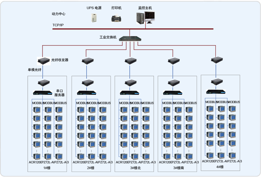 系統(tǒng)采用Acrel-5000型能耗監(jiān)控系統(tǒng),整個(gè)系統(tǒng)采用網(wǎng)絡(luò)分布式結(jié)構(gòu),監(jiān)控主機(jī)位于消防監(jiān)控室中,所有配電回路均配備安科瑞電力儀表PZ系列,以及一些水表。該項(xiàng)目實(shí)現(xiàn)了銀川建發(fā)大閱城?凱悅酒店能耗系統(tǒng)的智能管理,所有監(jiān)控設(shè)備均通過(guò)屏蔽雙絞線至后臺(tái)的通訊管理機(jī),從而實(shí)現(xiàn)遠(yuǎn)程監(jiān)控。