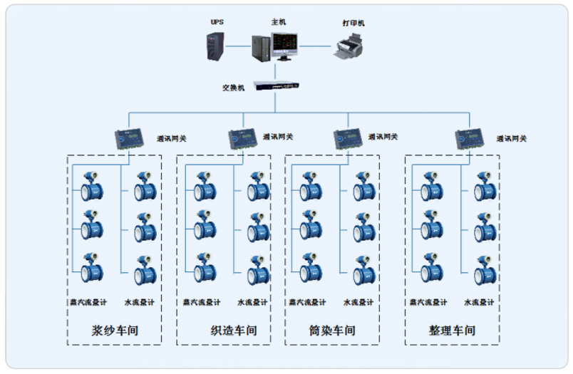 系統(tǒng)采用Acrel-5000型能耗監(jiān)測(cè)系統(tǒng),整個(gè)系統(tǒng)采用網(wǎng)絡(luò)分布式結(jié)構(gòu),監(jiān)控主機(jī)位于現(xiàn)場(chǎng)數(shù)據(jù)機(jī)房中,現(xiàn)場(chǎng)主要監(jiān)測(cè)儀表為水、蒸汽的流量計(jì),位于現(xiàn)場(chǎng)4個(gè)生產(chǎn)車間內(nèi)。該項(xiàng)目實(shí)現(xiàn)了常州強(qiáng)聲紡織有限公司內(nèi)能源的智能管理。所有監(jiān)控設(shè)備均通過(guò)屏蔽雙絞線至各自車間內(nèi)的通訊管理機(jī),再通過(guò)光電轉(zhuǎn)換器經(jīng)過(guò)光纖將數(shù)據(jù)傳輸至數(shù)據(jù)中心,從而實(shí)現(xiàn)遠(yuǎn)程監(jiān)控。