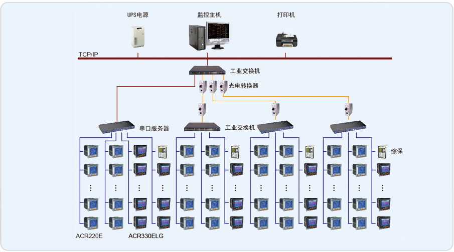 中化平原電力監(jiān)控系統(tǒng)現(xiàn)場(chǎng)分為5個(gè)低壓配電室,配電室內(nèi)采用安科瑞PZ系列電力監(jiān)控儀表采集各回路的電流、電壓、電能等電參量,然后通過中間層采集設(shè)備經(jīng)光纖傳到監(jiān)控室計(jì)算機(jī)上,實(shí)現(xiàn)遙測(cè)、遙信功能。
