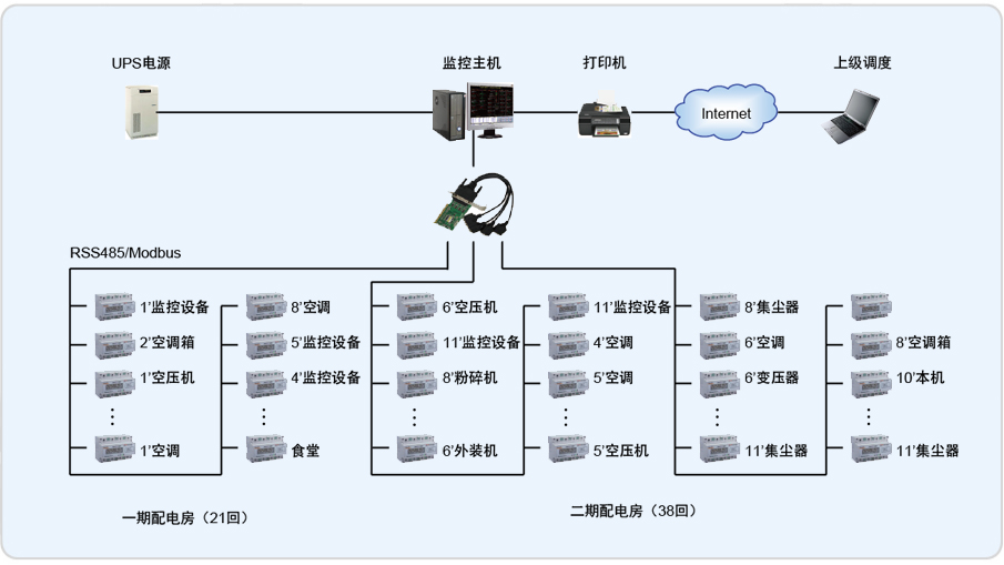 整個系統(tǒng)采用分布式結(jié)構(gòu),監(jiān)控主機位于東區(qū)主辦公室內(nèi),一期配電房和二期配電房采用RS485總線直接接入監(jiān)控主機擴展卡的串口。對于每個回路采用ADL 300-EF/C三相電能表,共59個回路;站控層應(yīng)用國內(nèi)知名的聯(lián)想商用計算機作為監(jiān)控主機,同時設(shè)有用于報表打印輸出的打印機;防止異常斷電而引發(fā)的數(shù)據(jù)丟失的UPS設(shè)備。監(jiān)控軟件平臺采用單機版Acrel-2000型電力監(jiān)控系統(tǒng)。Acrel-2000型電力監(jiān)控系統(tǒng)預(yù)留了擴展接口,可方便進行擴展。