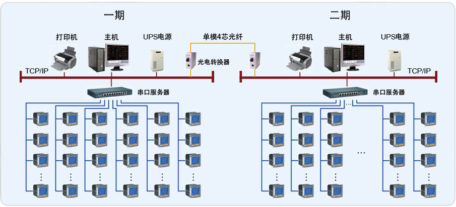 二期電力監(jiān)控:二期配電房?jī)?nèi)有4臺(tái)變壓器(5#變壓器、6#變壓器、7#變壓器、8#變壓器),共有187臺(tái)ACR120EL,現(xiàn)場(chǎng)采用9根RS485總線上傳至主機(jī)。