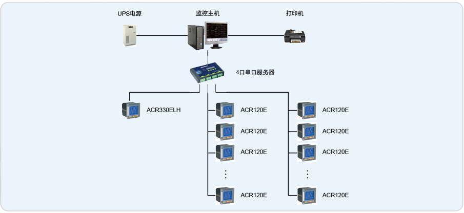 廠區(qū)配電中心為本項(xiàng)目提供一套高、低壓后臺(tái)監(jiān)控系統(tǒng),將對(duì)廠區(qū)內(nèi)電氣室中改造安裝的19塊智能電測(cè)儀表進(jìn)行集中監(jiān)視。具體監(jiān)控?cái)?shù)據(jù)為:用電量計(jì)量、實(shí)時(shí)測(cè)量相電壓、線電壓、有功功率、無功功率、視在功率、功率因數(shù)、頻率等數(shù)據(jù),能打印月度用電報(bào)表,并有歷史曲線的查詢(時(shí)間不小于30天),重要回路需要對(duì)其諧波進(jìn)行測(cè)量。各參數(shù)及數(shù)據(jù)通過RS485總線,通過網(wǎng)絡(luò)送至配電中心的電工值班室(后臺(tái)監(jiān)控中心)。