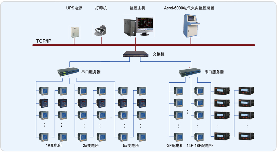 本項(xiàng)目采用Acrel-6000電氣火災(zāi)監(jiān)控系統(tǒng),監(jiān)控范圍主要為處于地下室的低壓配電間和各個樓層中的配電柜。客戶系統(tǒng)需求為探測漏電電流、過電流、超溫度等信號,發(fā)出聲光信號報警,準(zhǔn)確報出故障線路地址,監(jiān)視故障點(diǎn)的變化。儲存各種故障和操作試驗(yàn)信號,顯示系統(tǒng)電源狀態(tài)。