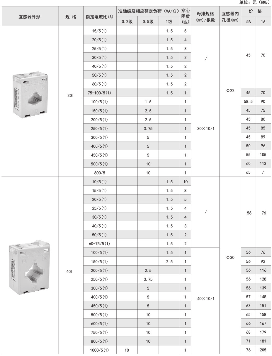 技術要求:額定電流比100A/5A; 準確級1級; 穿心匝數1匝;額定負荷1.5VA;內孔徑φ22mm;穿排規格30mm x 10mm 1根。